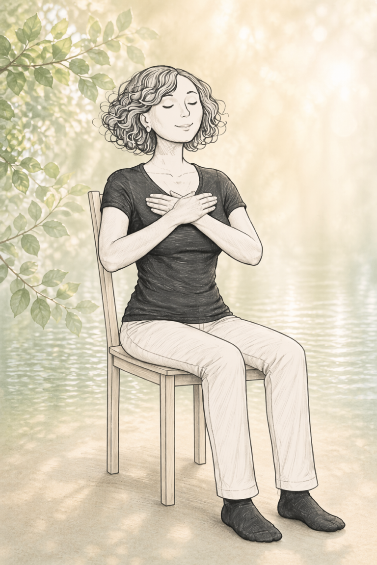Umfasse jeden einzelnen Finger der linken Hand mit der rechten Hand (und/oder umgekehrt) achtsam, präsent und ganz ohne Druck oder massieren.